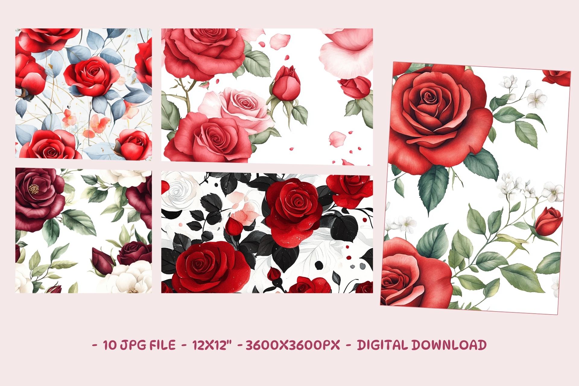 🌹 Red Rose Seamless Patterns - Watercolor Floral Digital Paper