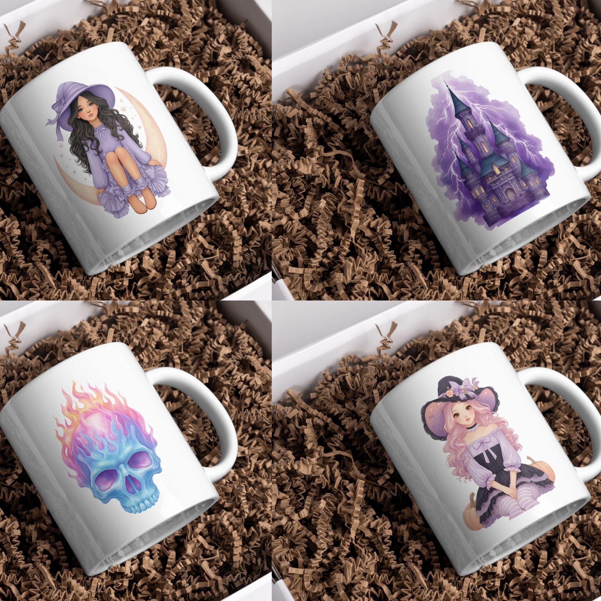 Various elements: pastel witches, potions, hats, pumpkins, moons, gothic castles, cats, accessories