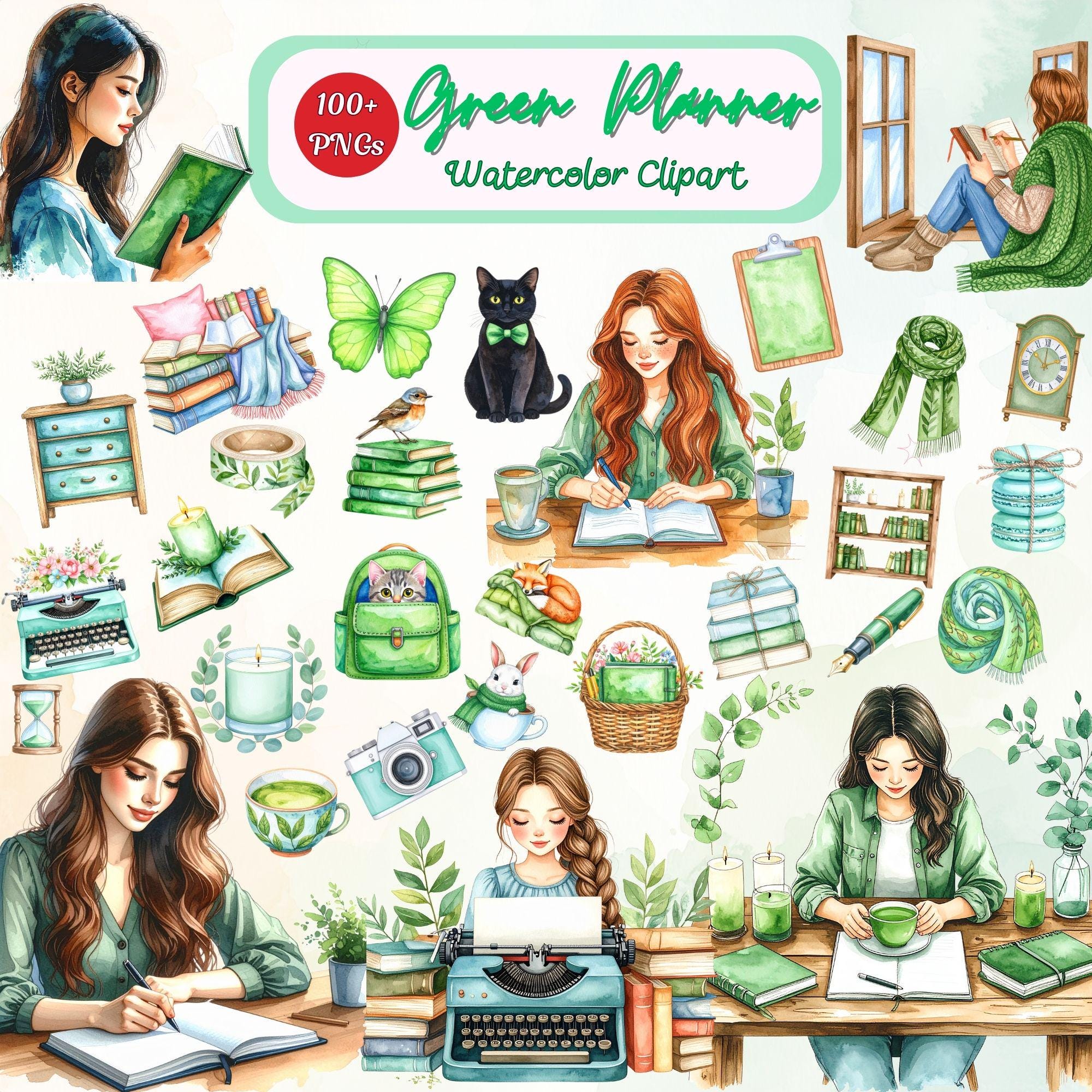 📚🌿 Escape into a cozy world of creativity with this Green Planner Clipart Bundle!