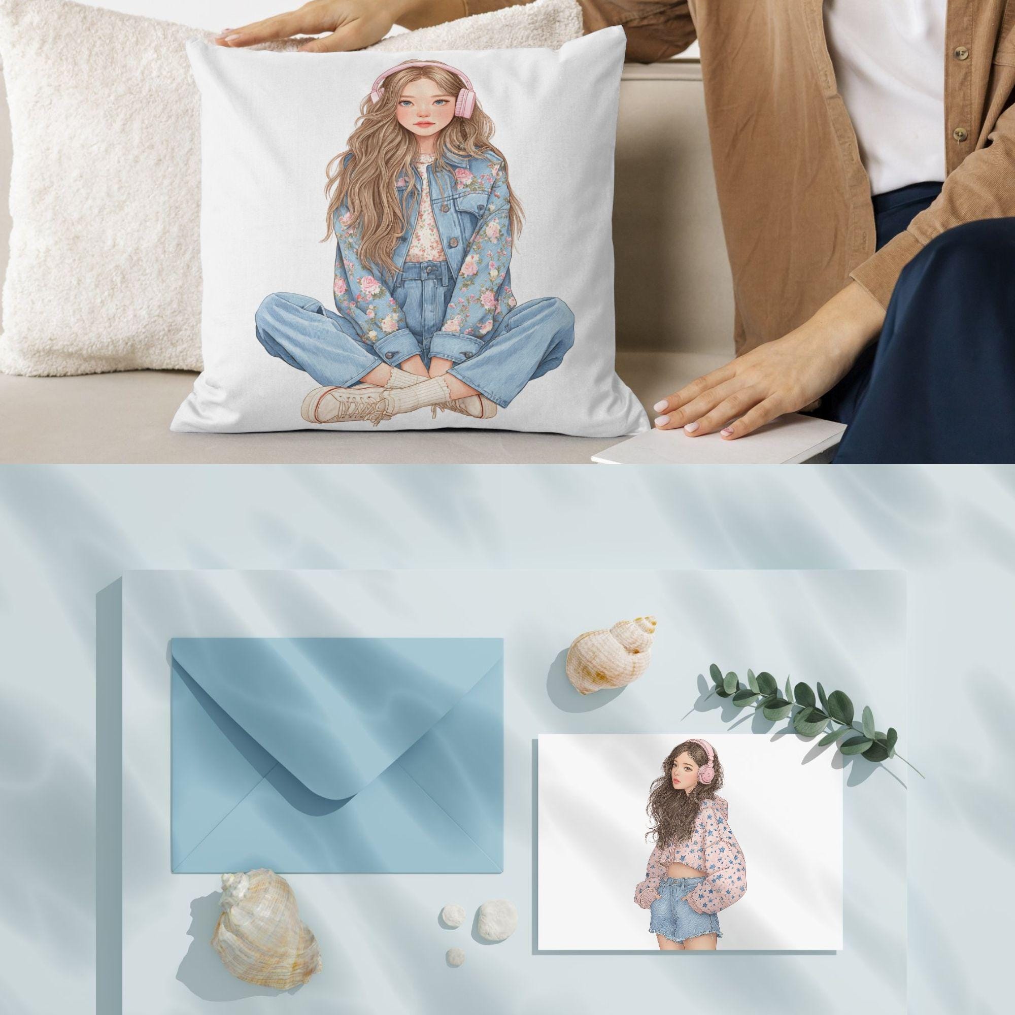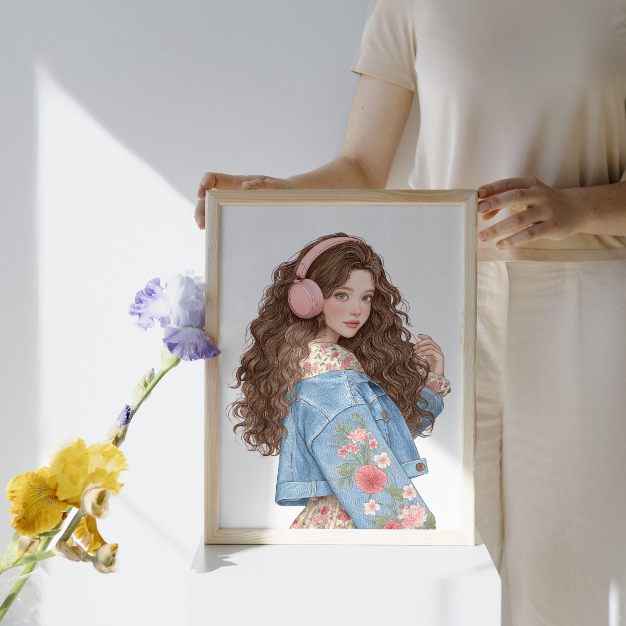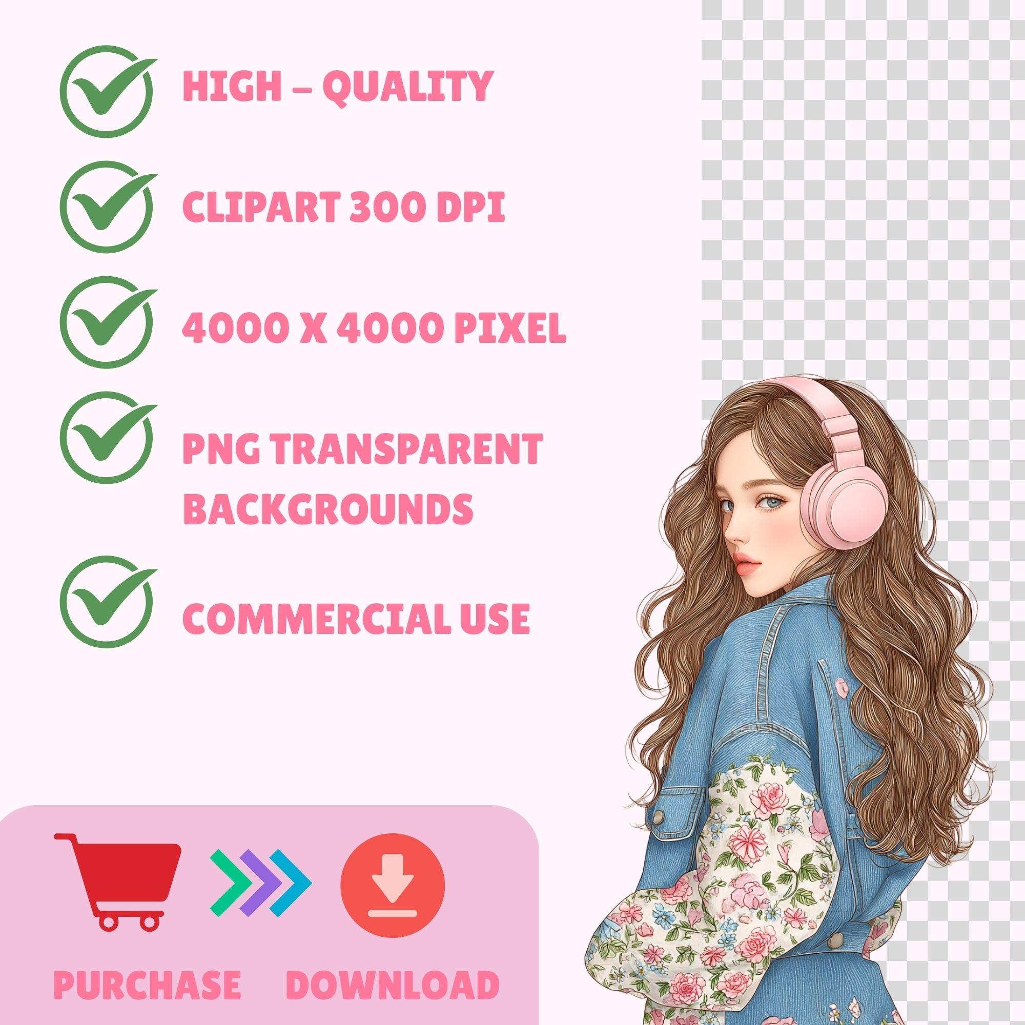 🎧💐 Introducing the Sweet Denim Girl Clipart Collection – soft, stylish, and utterly charming!