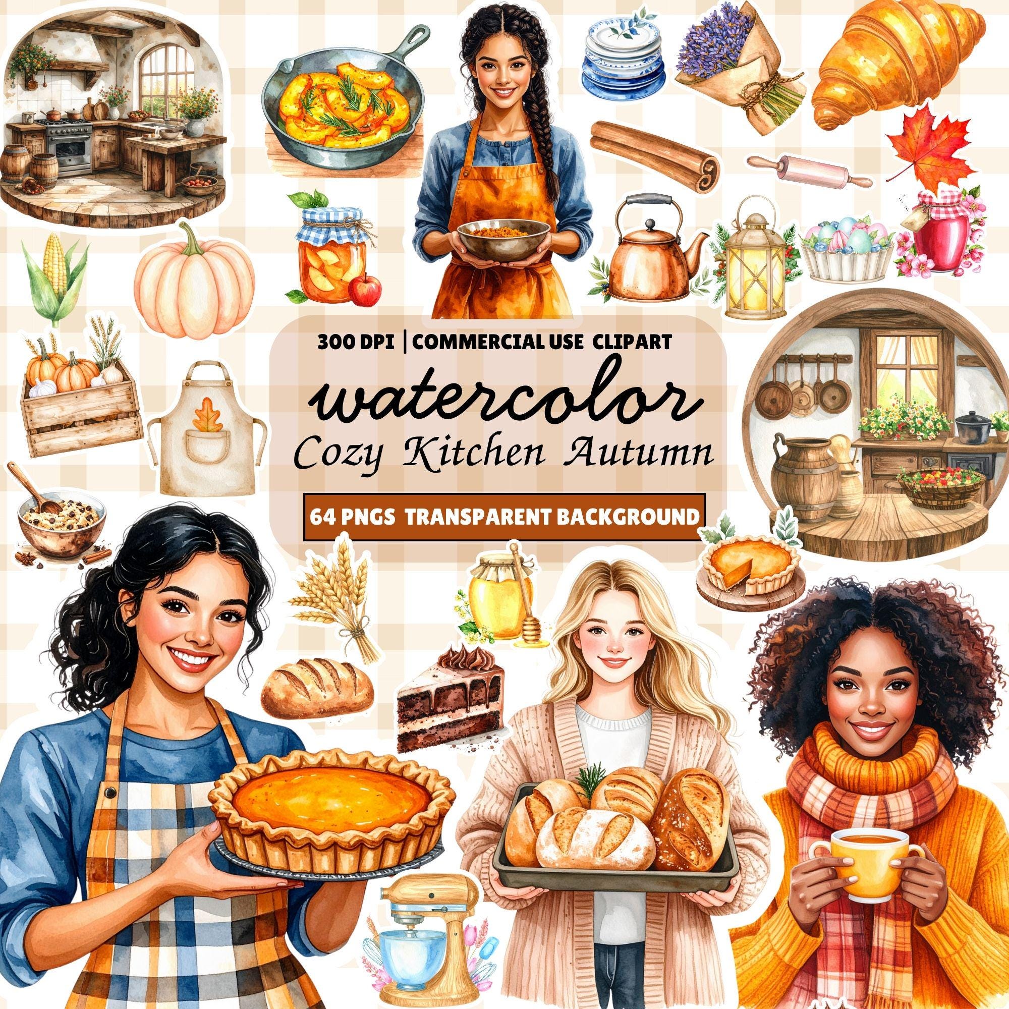 Watercolor kitchen clipart, watercolor kitchen PNG, cozy cottage baking art, farmhouse kitchen decor, rustic autumn cooking clipart, JPG, cottagecore illustrations.