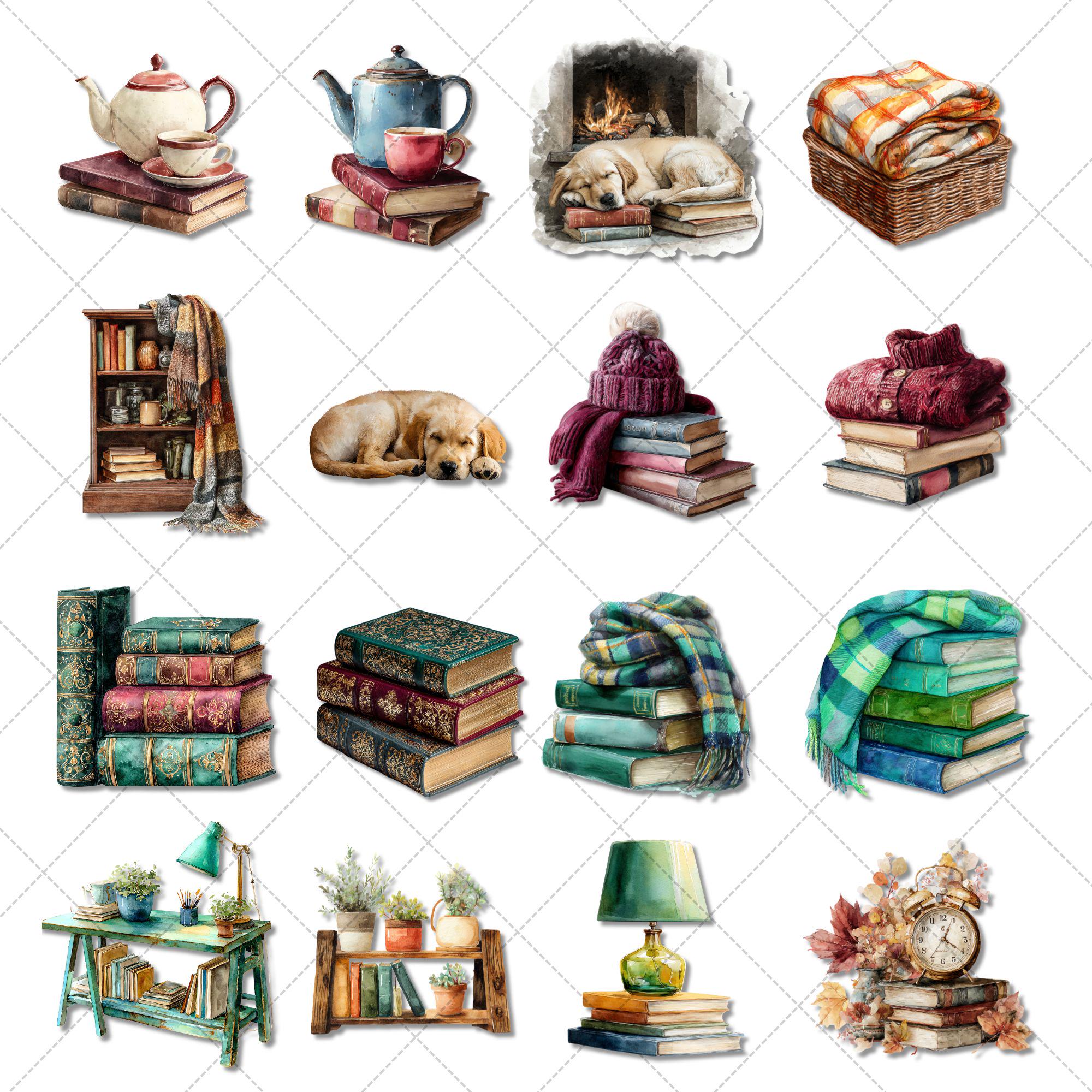 Themes: book stacks, wreaths, candles, teapots, cozy chair & fireplace scenes, window nooks, vintage phones, typewriters, blankets & sweaters, plants, clocks, and diverse bookish characters.