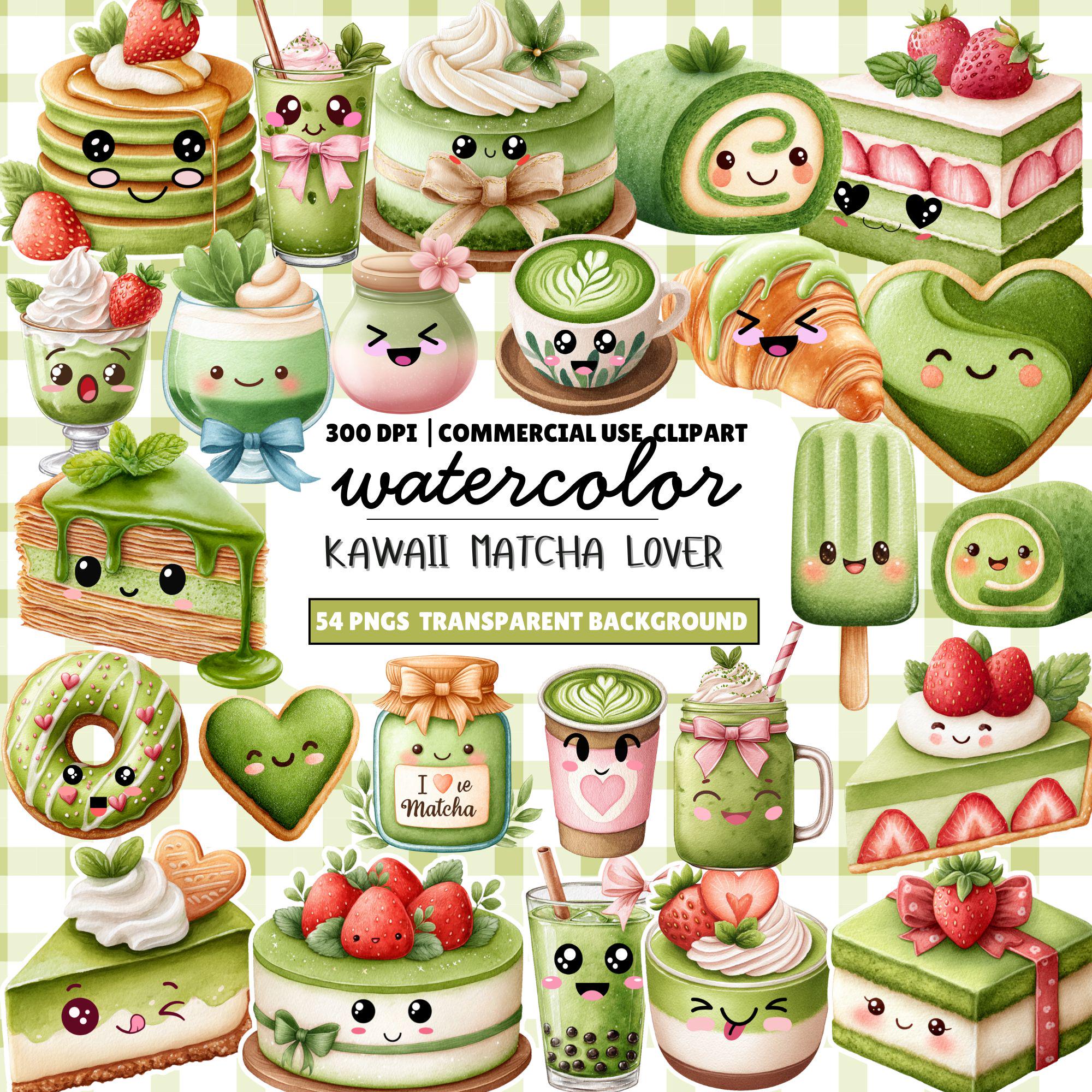 Bring sweetness and charm to your projects with this Kawaii Matcha Lover Watercolor Clipart Set.
