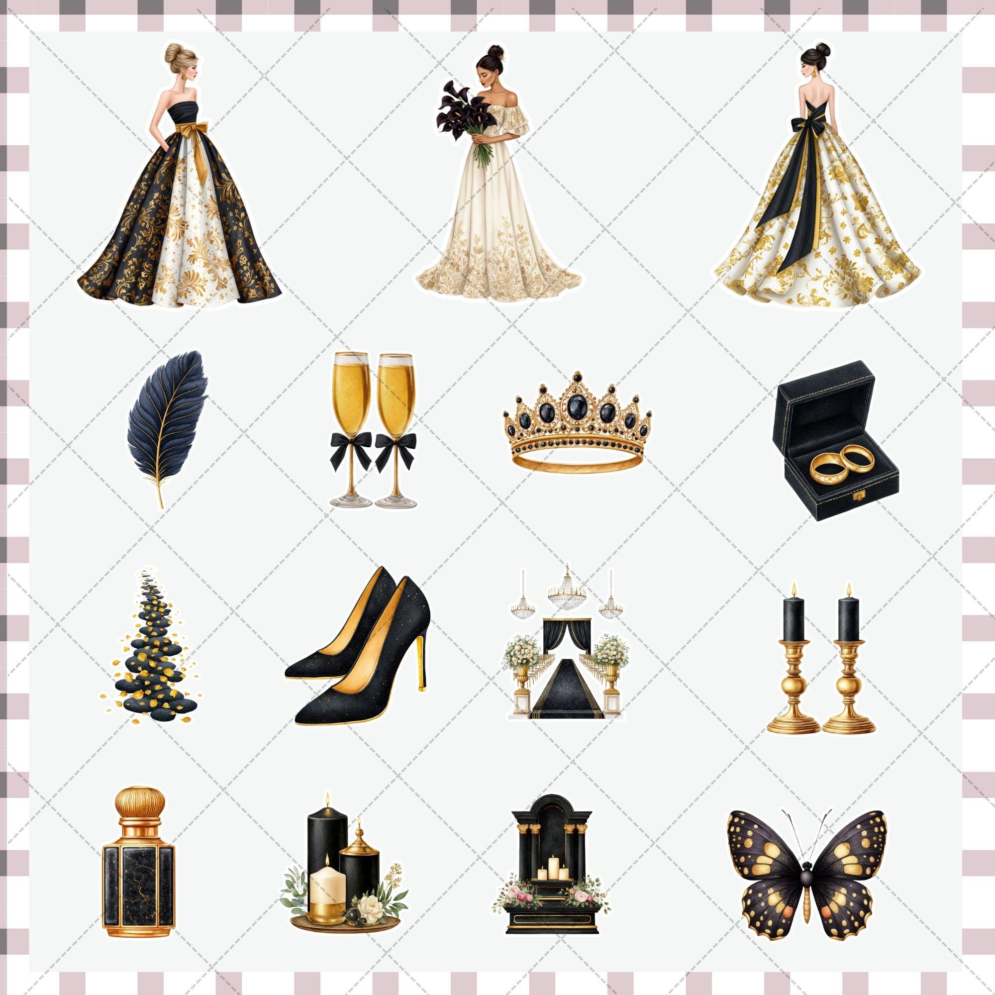 Elevate your wedding designs with this Wedding Clipart Black and Gold — a luxury watercolor wedding clipart set featuring elegant brides, grooms, floral arrangements, cakes, décor, and romantic details in a timeless black and gold palette. Perfect for invitations, branding, and creative projects that shine with sophistication.