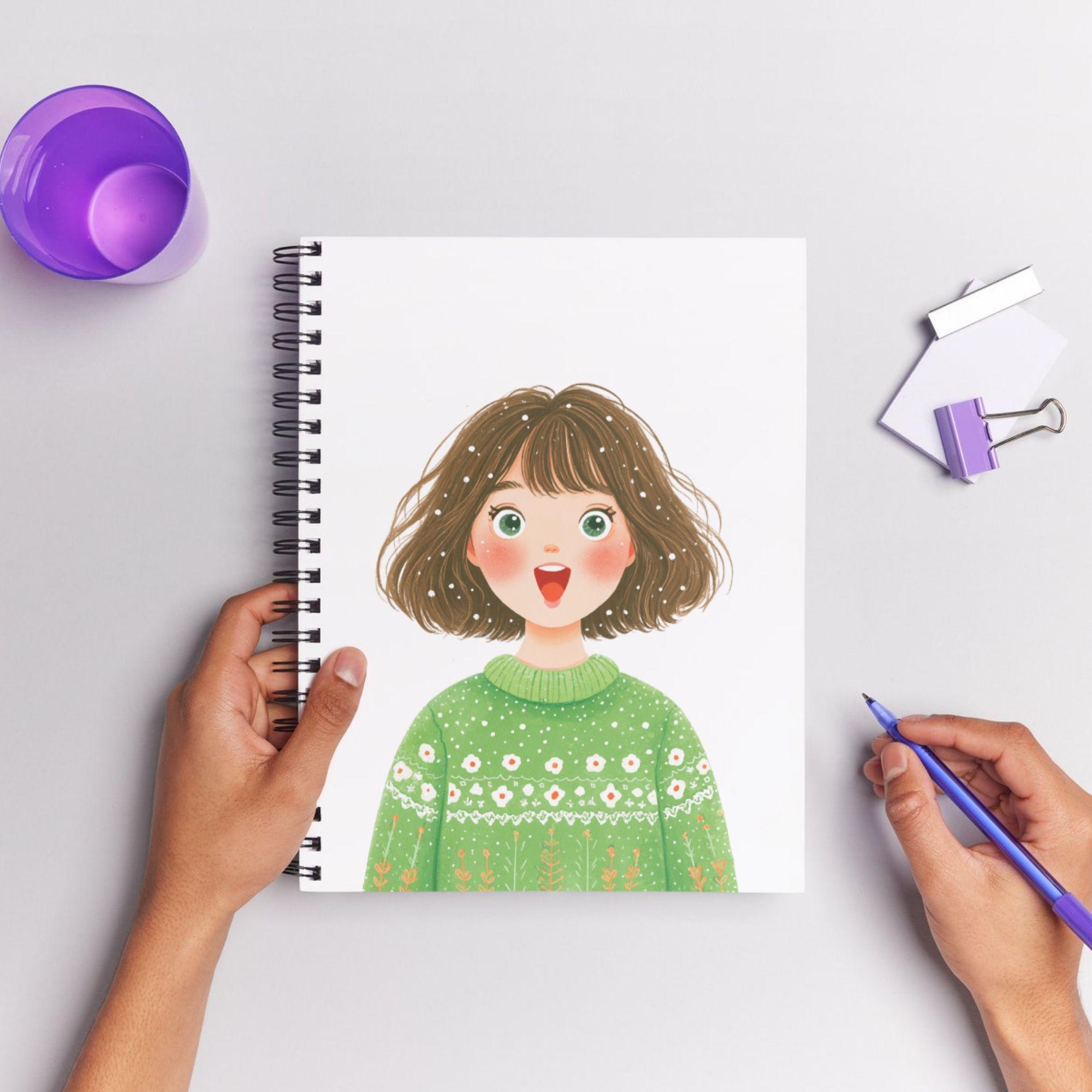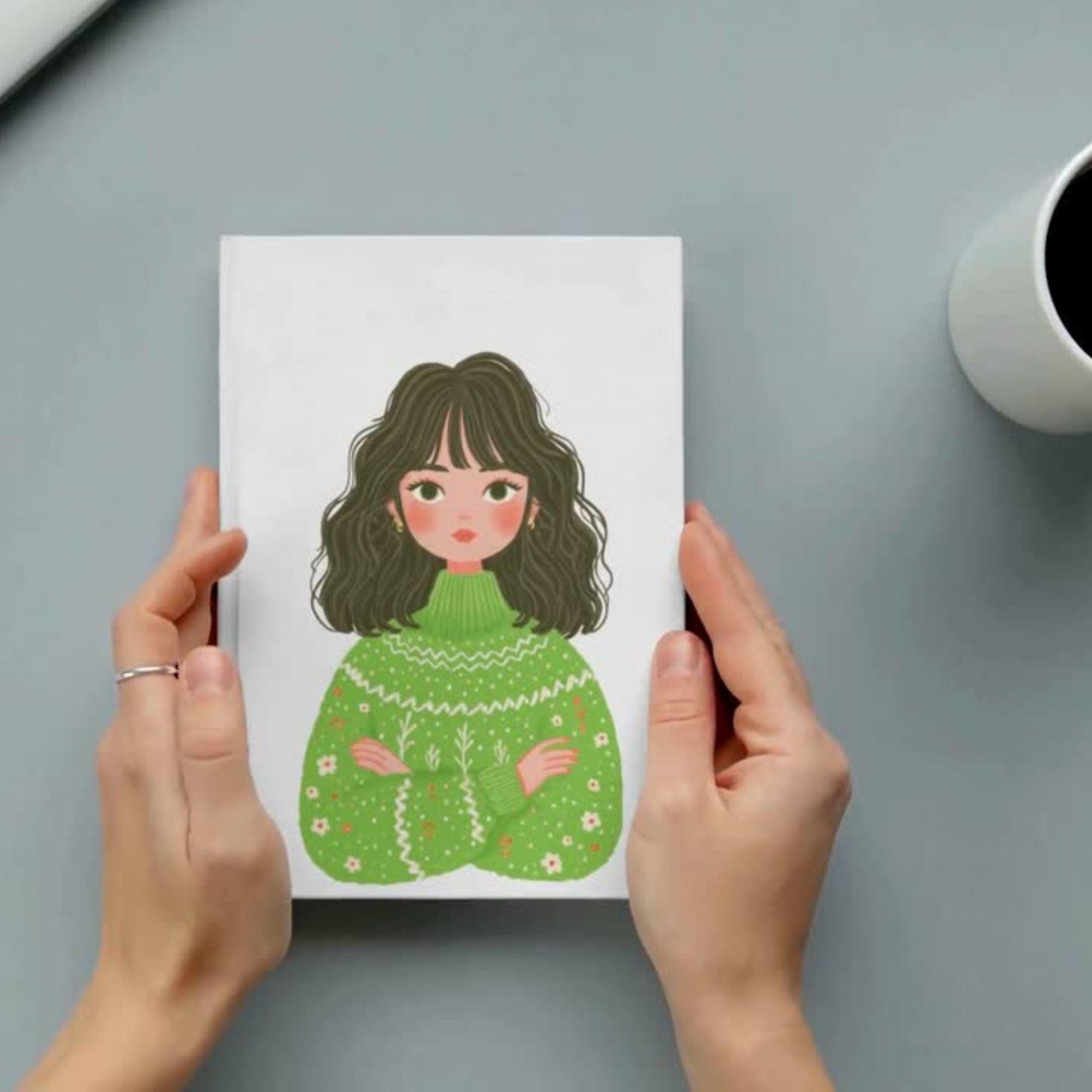 Each illustration features adorable girls in green sweaters with floral and holiday patterns โ perfect for Christmas, winter, or cozy aesthetic designs.