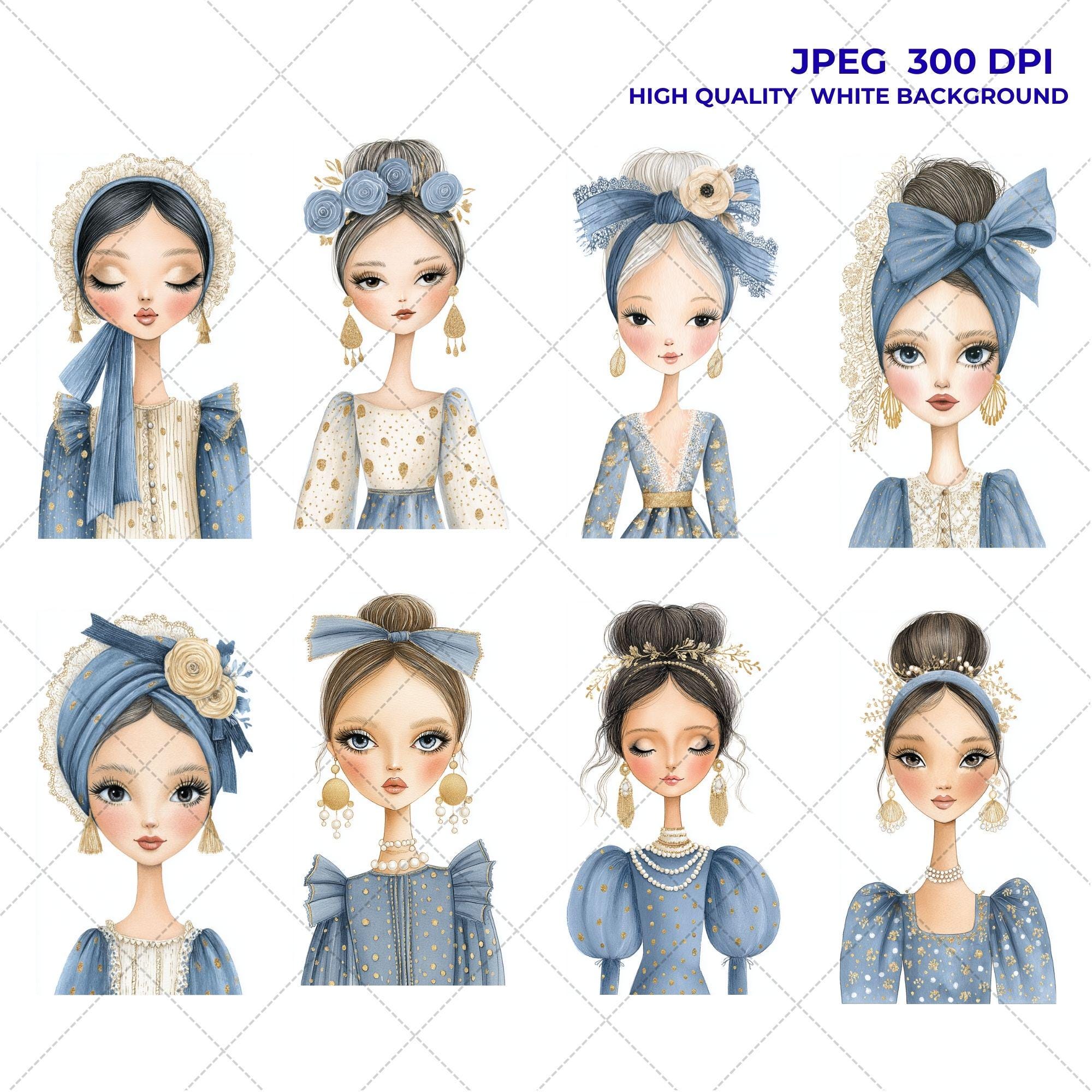This Victorian Ladies Clipart bundle captures the beauty, charm, and refined style of classic Victorian women—perfect for creators who adore feminine vintage aesthetics. Each illustration is detailed with blue fashion elements, soft facial expressions, and elegant hairstyles, making this Victorian Ladies Clipart collection ideal for journals, invitations, branding, packaging, and crafts.