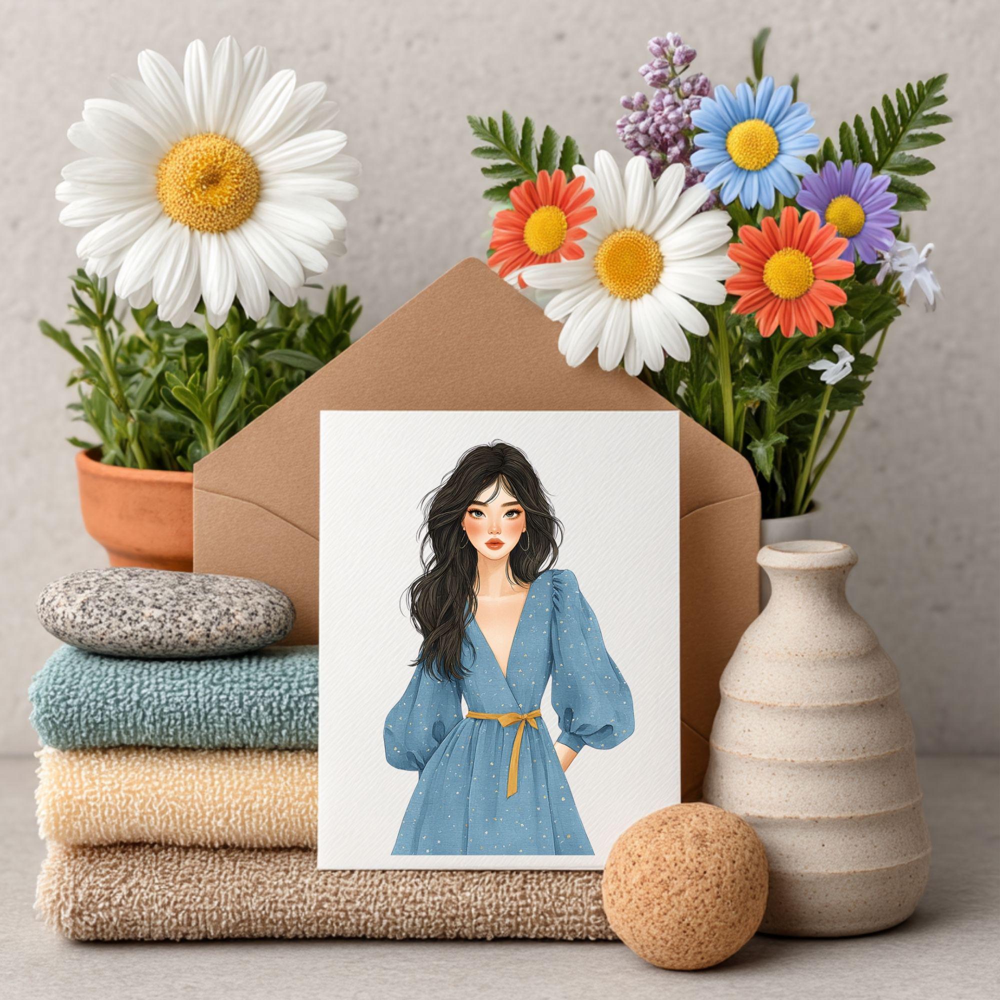 Blue Dress Girl Clipart collection features stunning watercolor portraits of young women in dreamy blue dresses, accented with golden-yellow ribbons and vintage accessories. Whether you love the "Cottagecore" aesthetic, farmhouse charm, or modern vintage fashion, these illustrations capture the perfect blend of serenity and style for your creative projects.