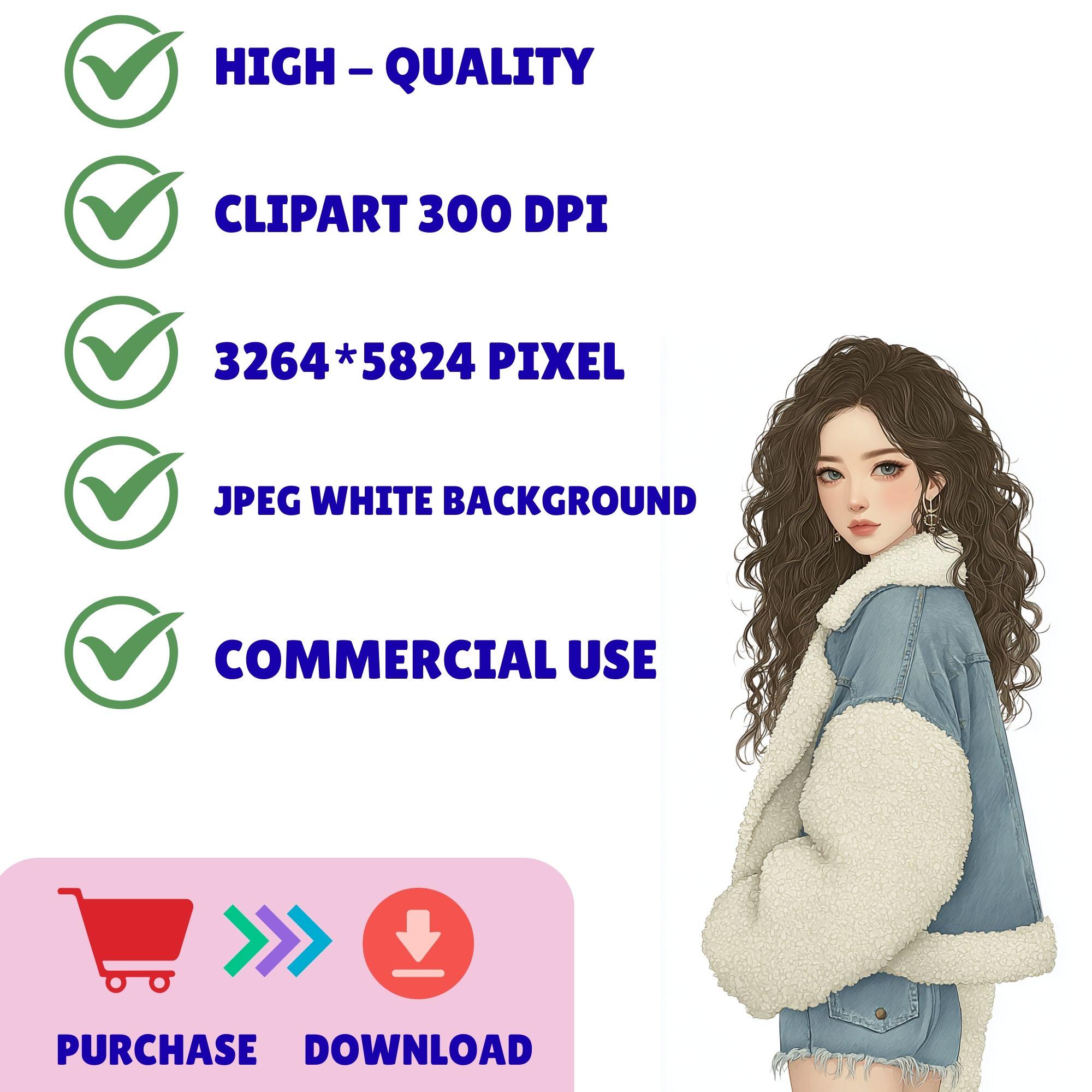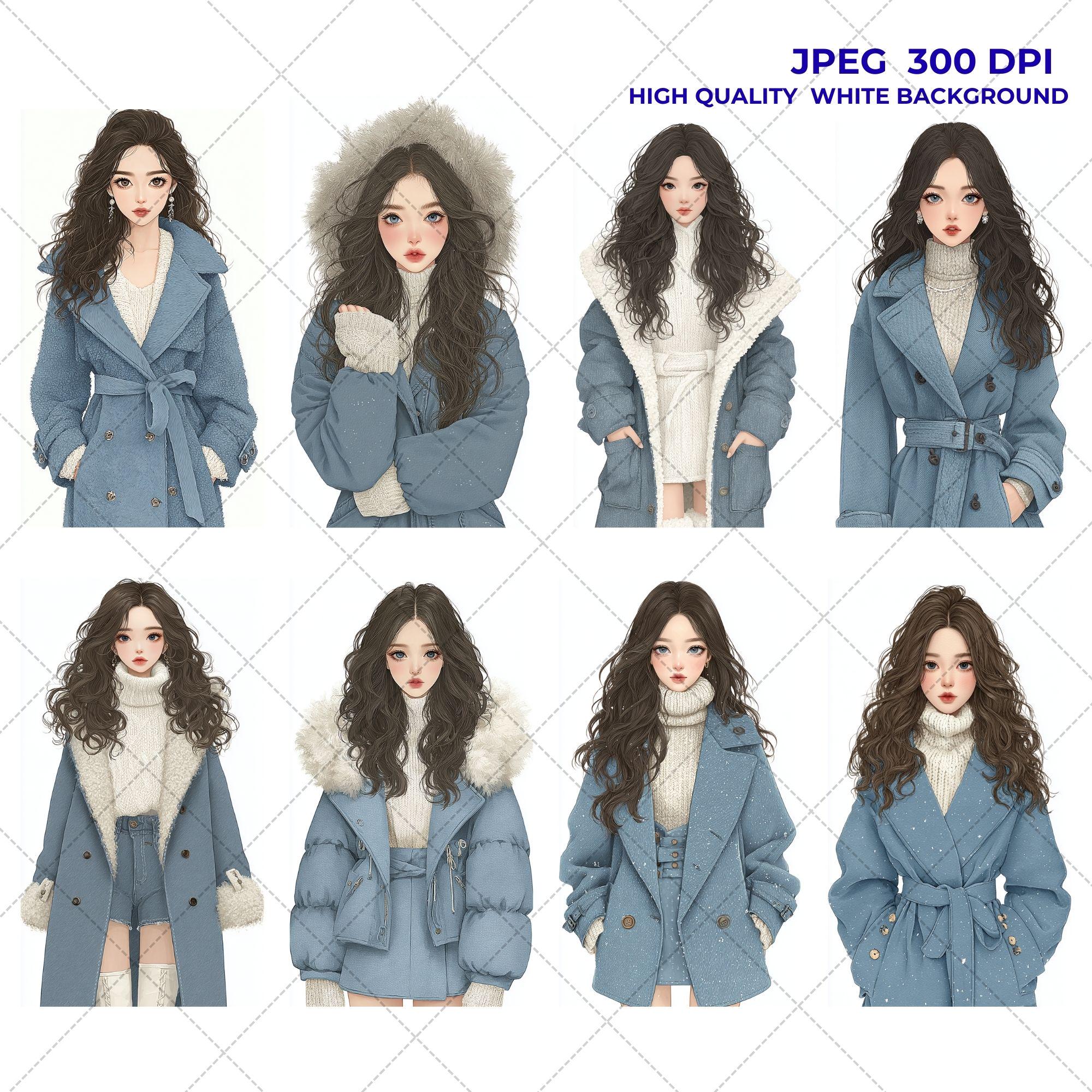 Each illustration features fashionable winter outfits, expressive faces, and delicate details that bring warmth and sophistication to your creative projects. This Winter Blue Coat Fashion Girl Clipart is perfect for designers who love chic seasonal artwork.