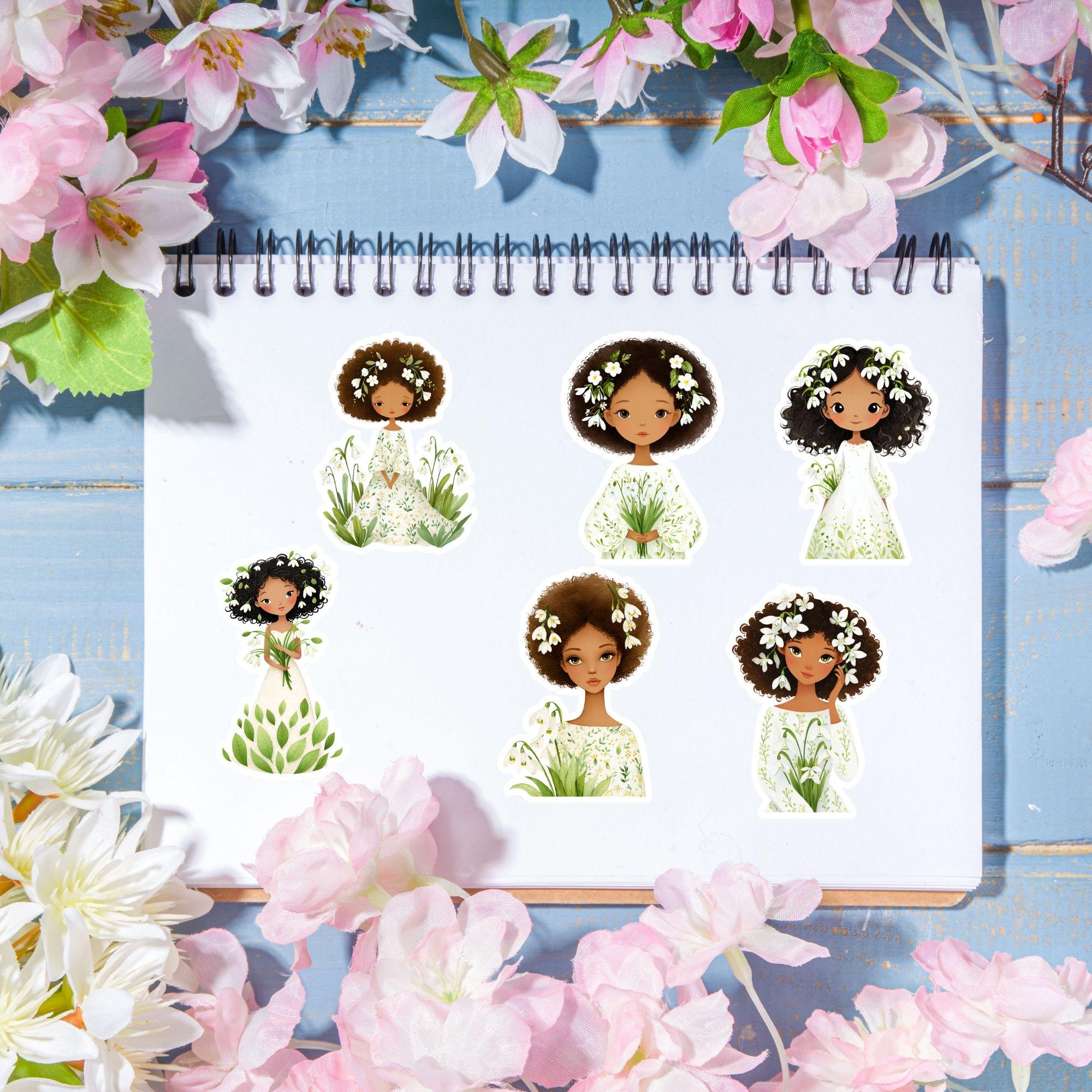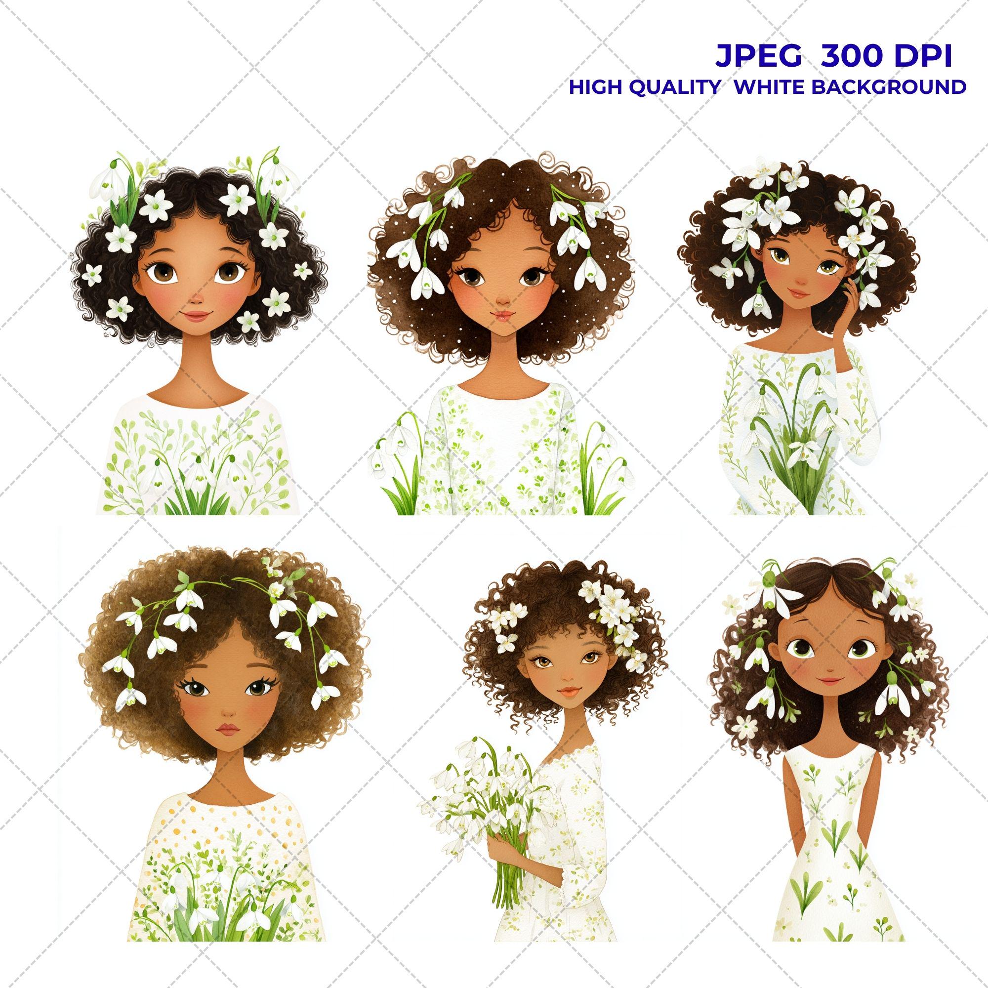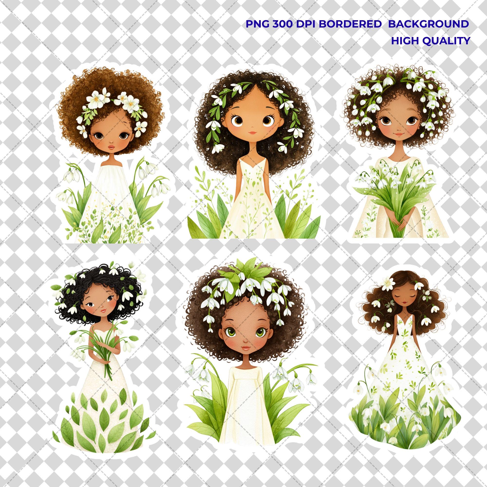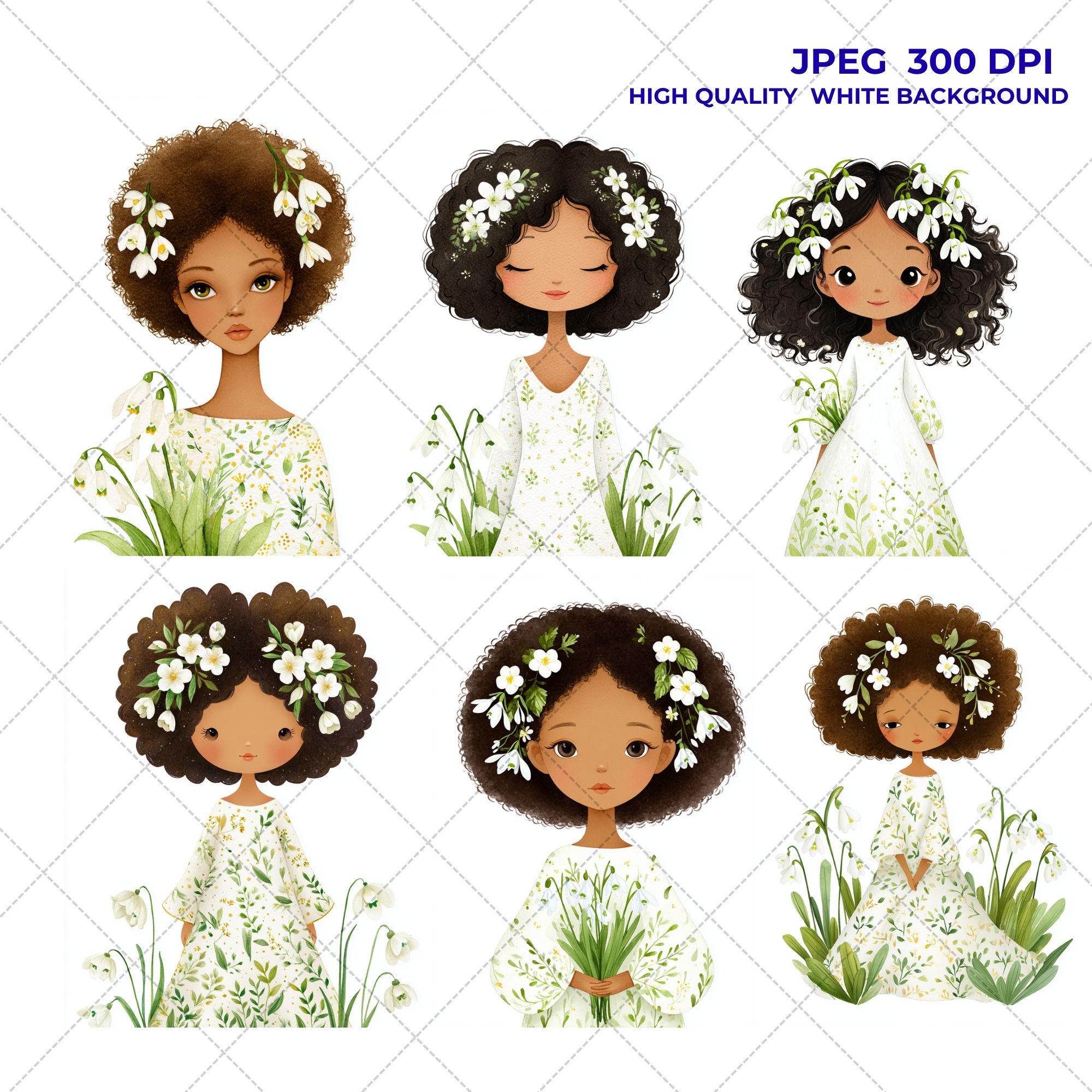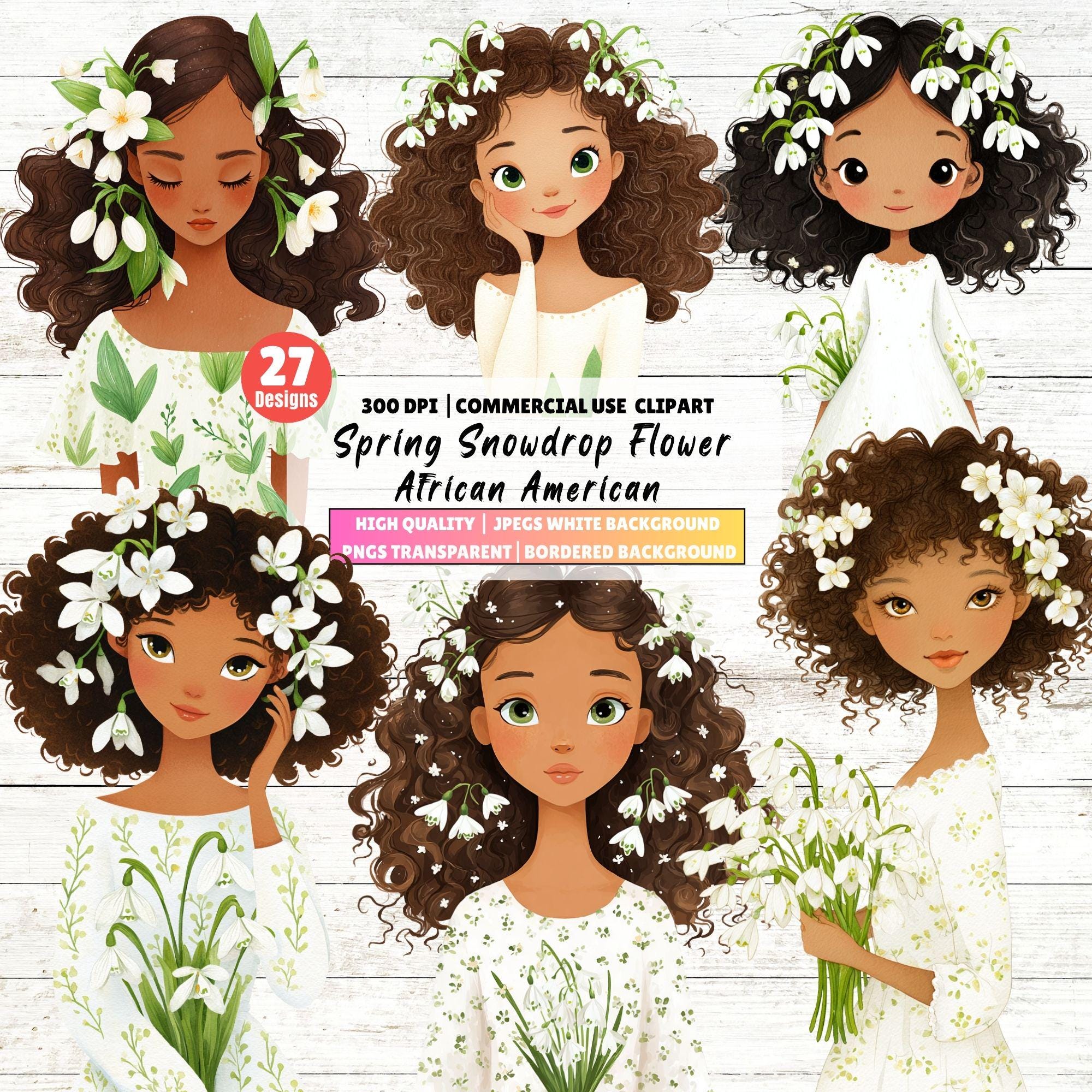Welcome the freshness of the season with our enchanting Spring Snowdrop Clipart collection! Imagine adding a touch of innocence and natural beauty to your creations with these adorable African American Girls adorned with delicate white Snowdrop Flowers. Whether you are crafting for Easter, creating spring planners, or designing unique merchandise, these illustrations capture the joy of blooming nature and diverse beauty. Perfect for adding a heartwarming vibe to any project!
